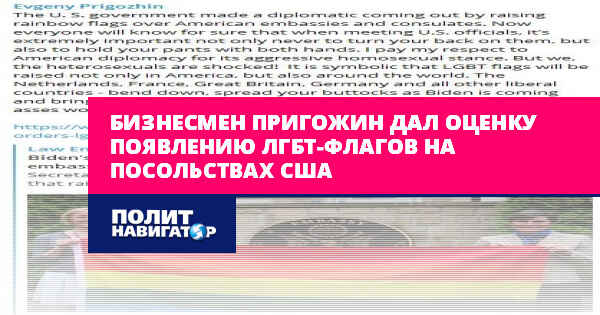 Бизнесмен Пригожин напомнил, что флаги сексуальных меньшинств будут водружены не только на здания, находящиеся в США. Их повесят на посольства и в других государствах, и далеко не всем понравится такая позиция администрации Байдена.
