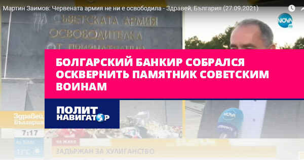 Известный в Болгарии банкир Мартин Заимов был задержан полицией за то, что хотел замазать краской надпись на монументе «Советской армии» в Софии.