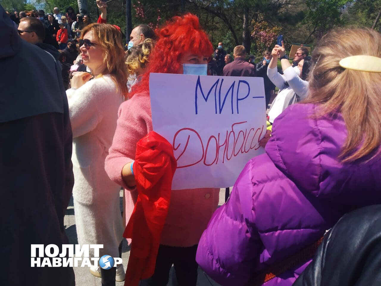 Нацики на Аллею Славы тоже проползли и растянули плакат: «За пэрэмогу Украины». Что ж, люди откровенно плевали в них, а так как сейчас многие ходят с карманными собачками, то в прямом смысле слова показывали им собачьи задницы. Полицаям это не нравилось, и они вещали в громкоговоритель «Кто положил цветы, уходите налево» — тоже по специальному «фильтрационному» маршруту. Кто не соглашался, тех вытесняли массой.