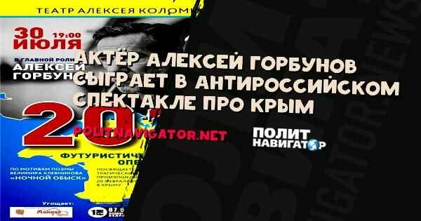 Актёр Алексей Горбунов, ранее поддержавший т.н. АТО на Донбассе и демонстративно отказавшийся от съемок в России, 30 июля выступит в Одессе в антироссийском спектакле “про трагические события” в Крыму зимой 2014 года, когда на полуострове началась Русская весна.