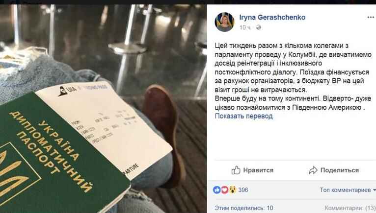 “Эту неделю вместе с несколькими коллегами из парламента проведу в Колумбии, где будем изучать опыт реинтеграции и инклюзивного постконфликтного диалога. Поездка финансируется за счет организаторов, из бюджета ВР на этот визит деньги не тратятся”, – сообщает Геращенко.