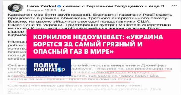«Советник министра энергетики Украины Елена Зеркаль, аки дитё малое, радуется бездоказательному заявлению американцев о том, что российский газ «самый грязный в мире» и что он в этой связи опасен при транспортировке. Пишет, что это известие – «просто бальзам на сердце». Что-то я не могу понять, а не Украина ли остервенело борется за сохранение транзита этого «самого опасного газа в мире»??? Если Киев принимает подход американцев, то нужно же срочно отказываться от транзита и потребления данного газа! Вот это будет «бальзам» – всем бальзамам бальзам», – с сарказмом отмечает Корнилов.