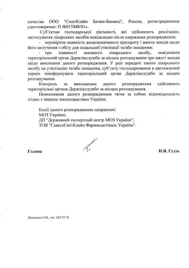 “Решение о запрете принято на основании письма ООО “ГлаксоСмитКляйн Фармасьютикалс Украина” и установлении факта наличия в обращении на территории Украины незарегистрированного лекарственного средства”, – говорится в сообщении.