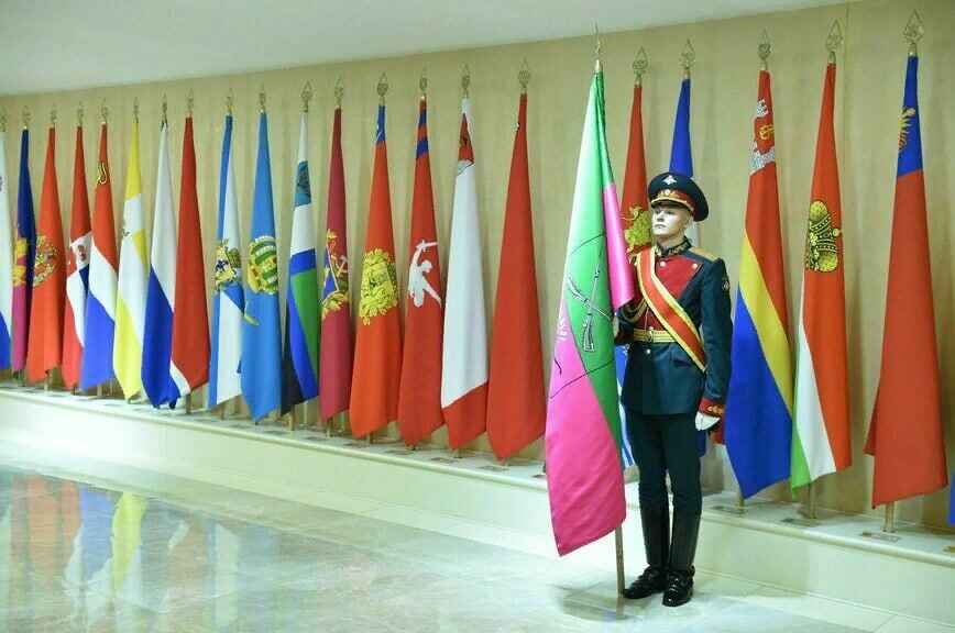 Солдаты роты почетного караула установили флаги Донецкой Народной Республики, Луганской Народной Республики, Запорожской области и Херсонской области.