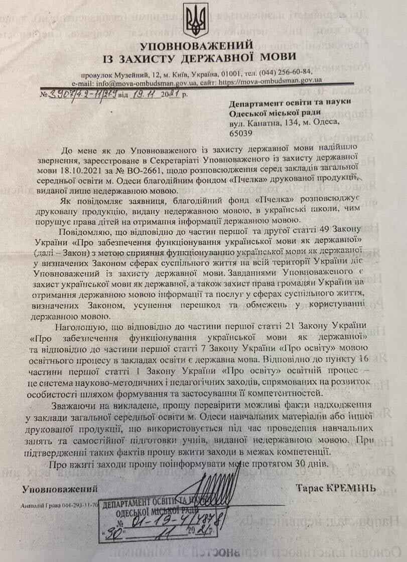 «Благотворительный фонд «Пчелка» распространяет печатную продукцию, изданную на негосударственном языке», — уведомил Креминь одесский департамент образования и потребовал «принять меры».