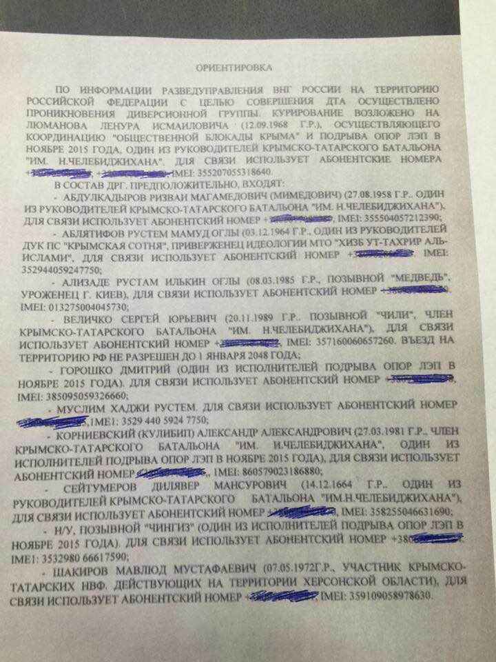 Депутат Верховной Рады Рефат Чубаров утверждает, что возглавляемая им запрещенная в РФ организация меджлис получила ориентировку российских силовиков, где содержится список лиц, которые проникли на территорию Крыма для совершения диверсий.
