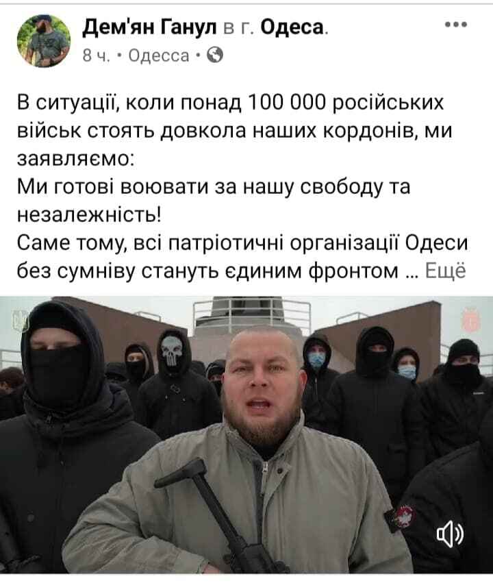 «В ситуации, когда более 100 000 российских войск (это цитата) стоят вдоль наших границ, мы заявляем: мы готовы воевать за нашу свободу и независимость! Именно поэтому все патриотические организации Одессы без сомнения станут единым фронтом против российских оккупантов», — такими словами сопроводил ролик упомянутый Ганул.