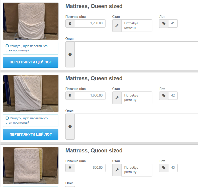 На продажу выставлены мебель, компьютерная техника, мобильные телефоны, холодильники и даже матрасы. Некоторые единицы техники очень старые, например, мобильные телефоны. Матрасы выглядят немного помятыми.