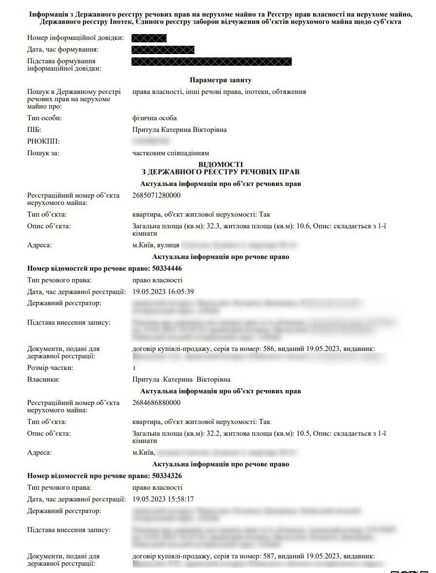Как следует из данных госреестра прав на недвижимое имущество, до этого счастливого дня чета Притул отнюдь не была бомжами. На двоих у них уже было четыре квартиры в Киеве. В 2016 году предприимчивые супруги купили в одной и той же столичной многоэтажке три соседние квартиры в доме на улице Златоустовской – однокомнатной площадью 84,9 м2 и трехкомнатной 120,3 м2.