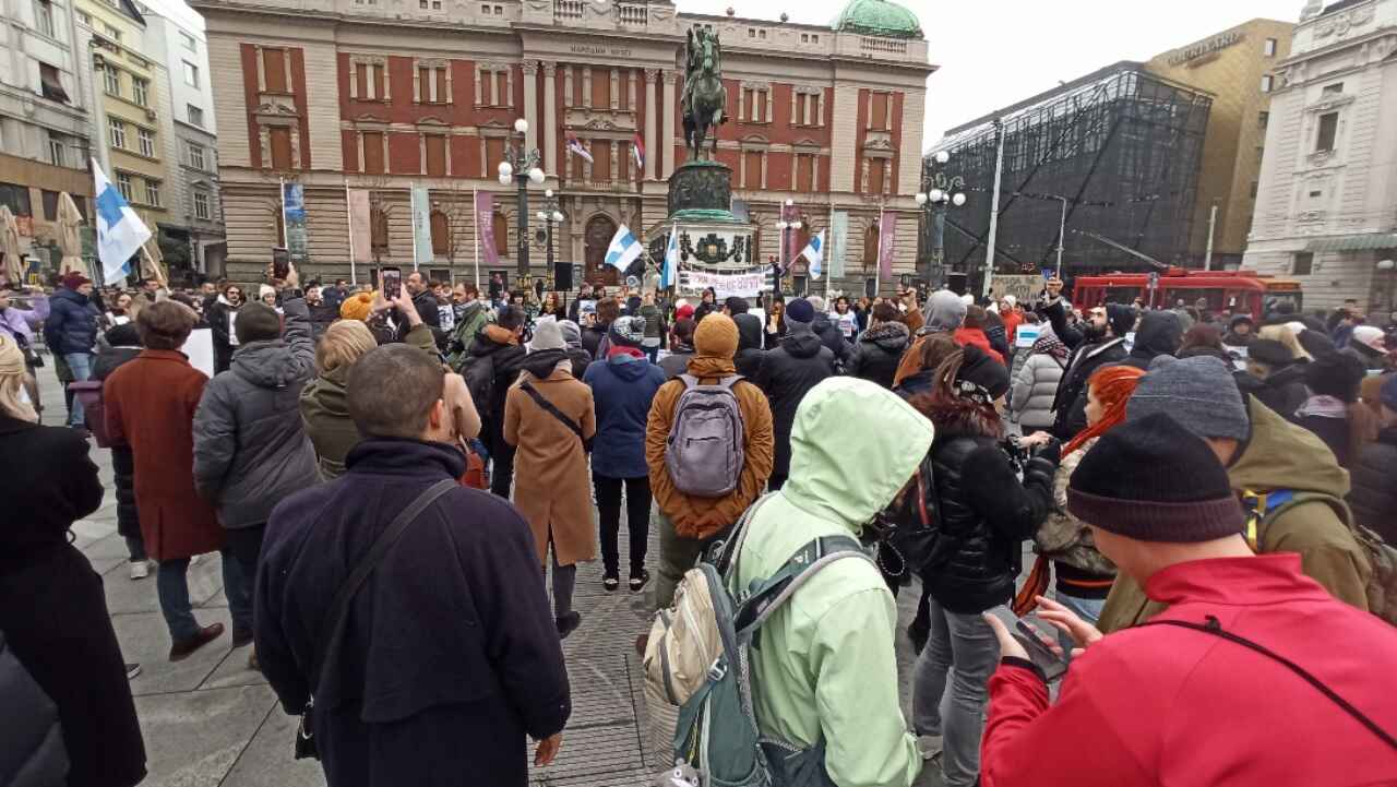 Акция продолжалась меньше часа, в ней приняли участие несколько десятков людей. По сообщению RT на Балканах, протестующие были агрессивно настроены, один из участников акции схватил журналистку российского СМИ за куртку и грубо толкнул с требованием прекратить видеосъемку.