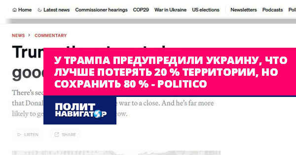 Politico пишет, со ссылкой на источник в Республиканской партии США, что в команде Трампа по неофициальным каналам предупредили киевское руководство о необходимости территориальных уступок «ради свободы и независимости» оставшихся под их управлением 80% страны.