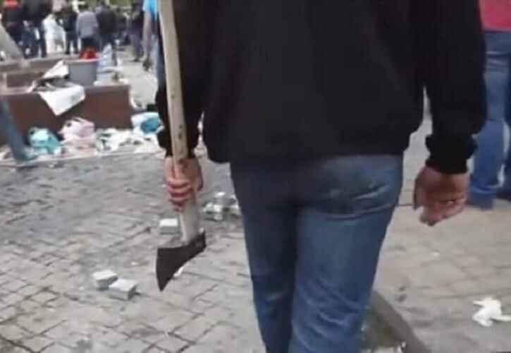 В это же время на находящейся неподалеку Греческой площади, где в 2014 году происходили ожесточенные столкновения, в память о погибших майдановцах разгуливает «мирный» проукраинский активист с топором.