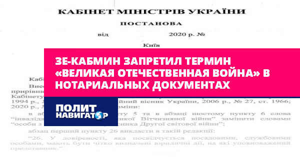 Кабинет министров Украины постановил осуществлять замену термина «Великая Отечественная война» на «Вторая мировая», а «инвалид» на «лицо с инвалидностью» в нотариальных документах, передает корреспондент «ПолитНавигатора».